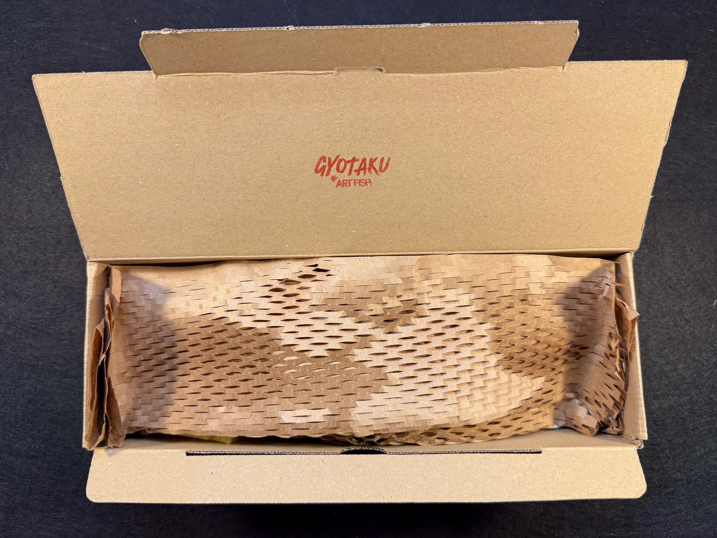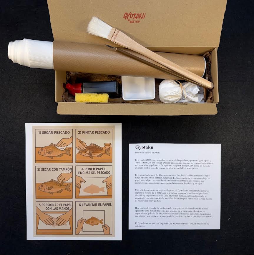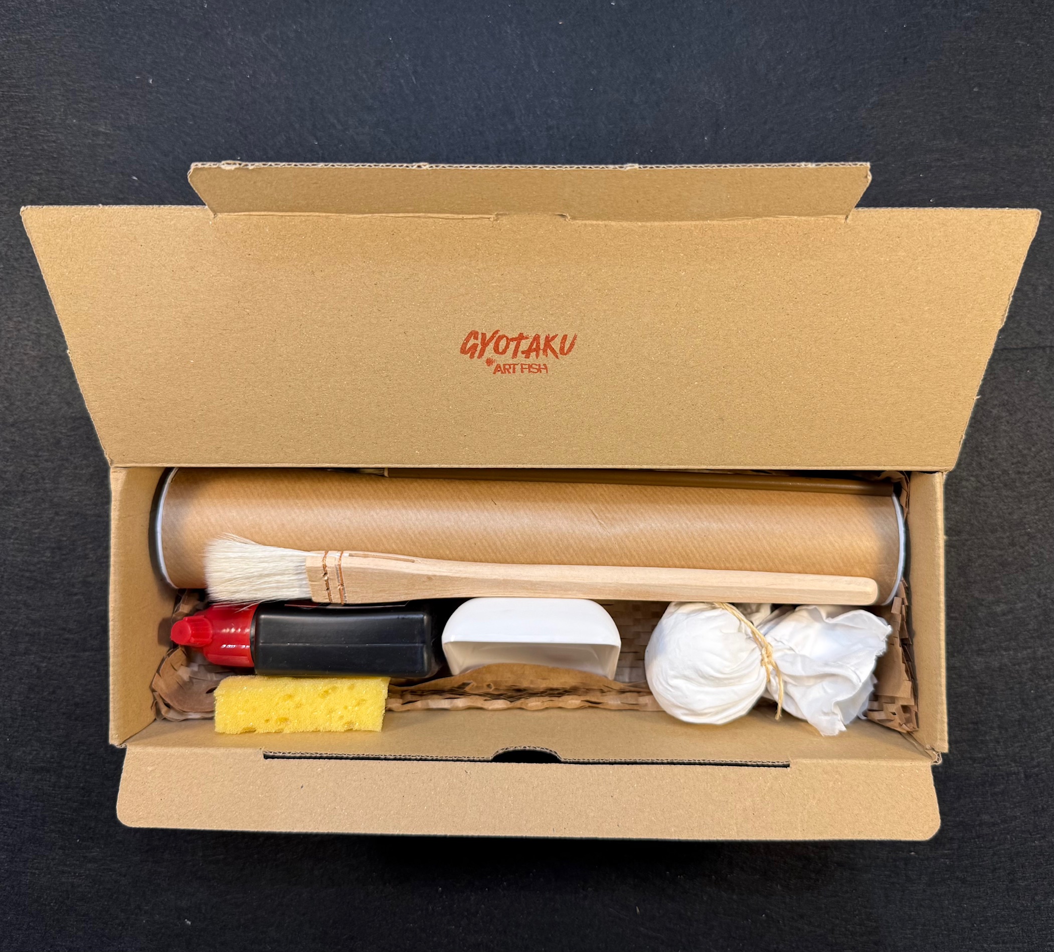 Kit Gyotaku, incluye todo lo necesario para hacer un autentico Gyotaku. 30 Hojas de papel washi o papel de arroz. 2 Pinceles, uno para pintar el pescado y otro para firmar. 1 Bote de 100 ml de tinta sumi. 1 Recipiente para poner la tinta. 1 Tampón para secar i repartir la tinta del pescado. 1 Esponja para presionar el papel contra el pescado. 1 Explicación y instrucciones del proceso.